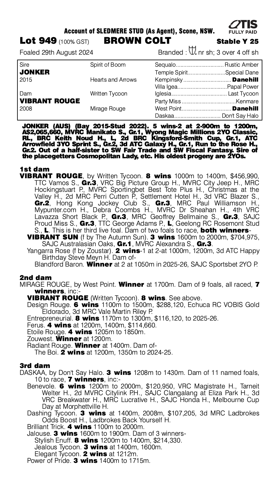 His pedigree is stacked with proven black-type and early ability. His dam, Vibrant Rouge, was a Group 3 winner herself, and her greatest achievement to date has been producing Vibrant Sun, winner of the Group 1 SAJC Australian Oaks, making this colt a half-brother to a Group 1 winner.