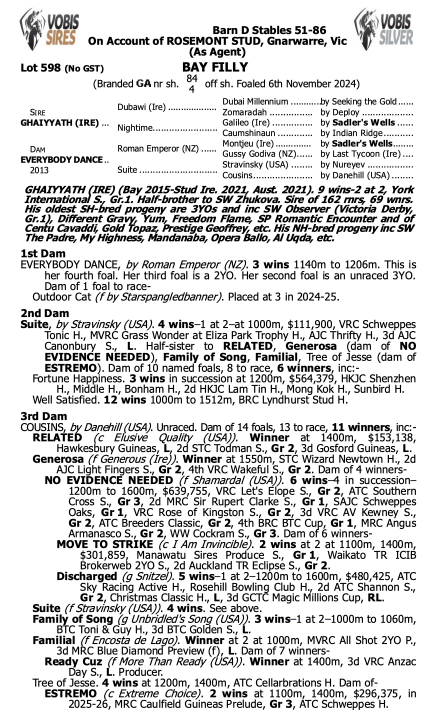 A well built, strong and athletic filly by Ghaiyyath out of Everybody Dance, she is very much in the mould her sire is already stamping into his progeny. She has strength, scope and a fluent, efficient action that suggests she will appreciate getting out over ground as she matures. Physically she profiles as the ideal classic style filly, the type you can set for Guineas and Oaks races as she progresses through her three year old season and beyond. She also represents a rare opportunity to race a daughter of the hottest young stallion in Australia. Ghaiyyath has taken the industry by storm, with his first crop now three year olds making a major impact. He has already sired a Group 1 winner in both hemispheres, highlighted locally by Observer, winner of the Australian Guineas and Victorian Derby. From his first crop alone he has produced a remarkable four stakes winners, operating at an outstanding 10 percent stakes winners to runners, an exceptional statistic for a young sire. He currently leads the second season sires table by both stakes winners and prizemoney, underlining just how significant a force he is becoming. This filly combines the physical presence and scope you want in a classic prospect with the pedigree power of a stallion firmly on the rise, making her an exciting long term racing proposition.